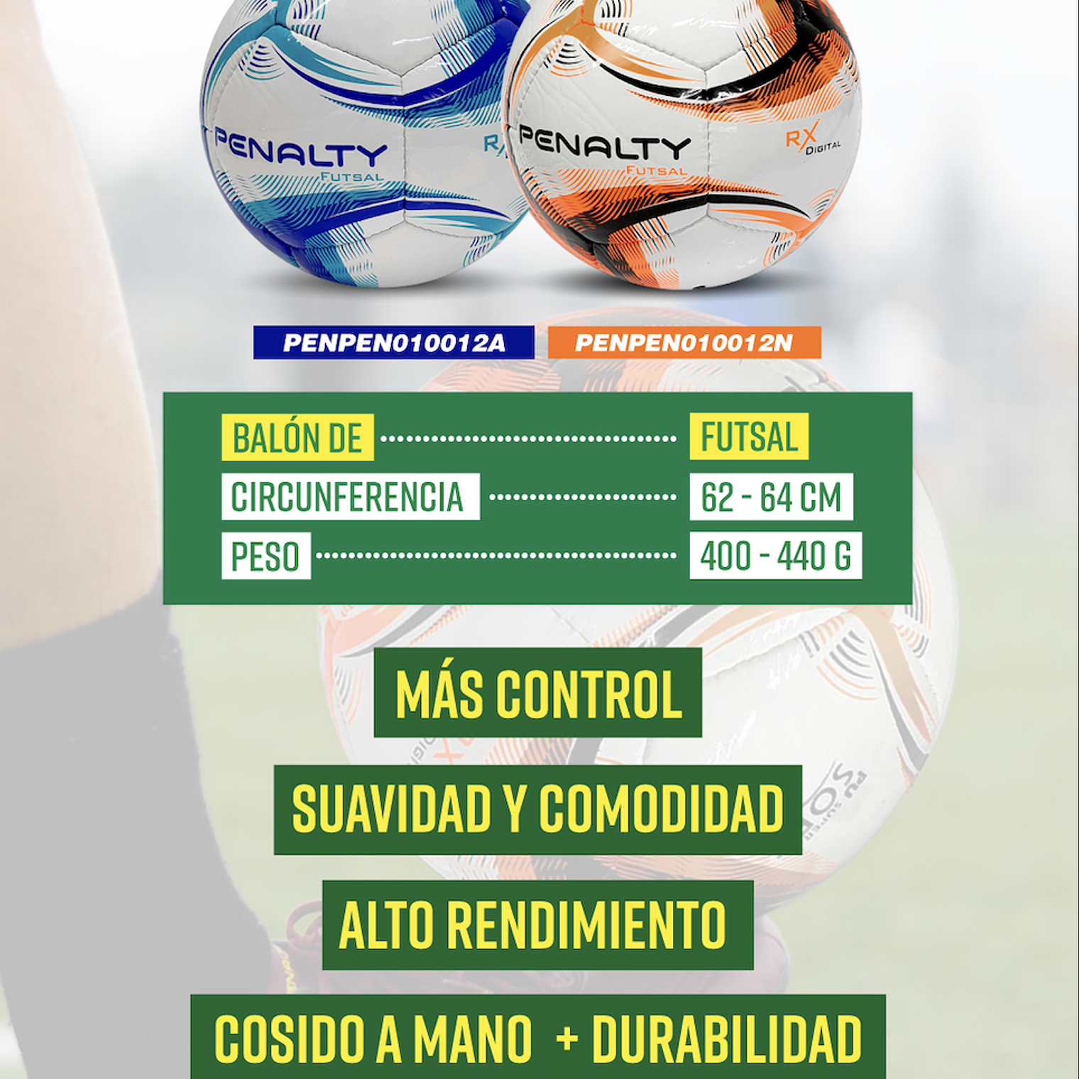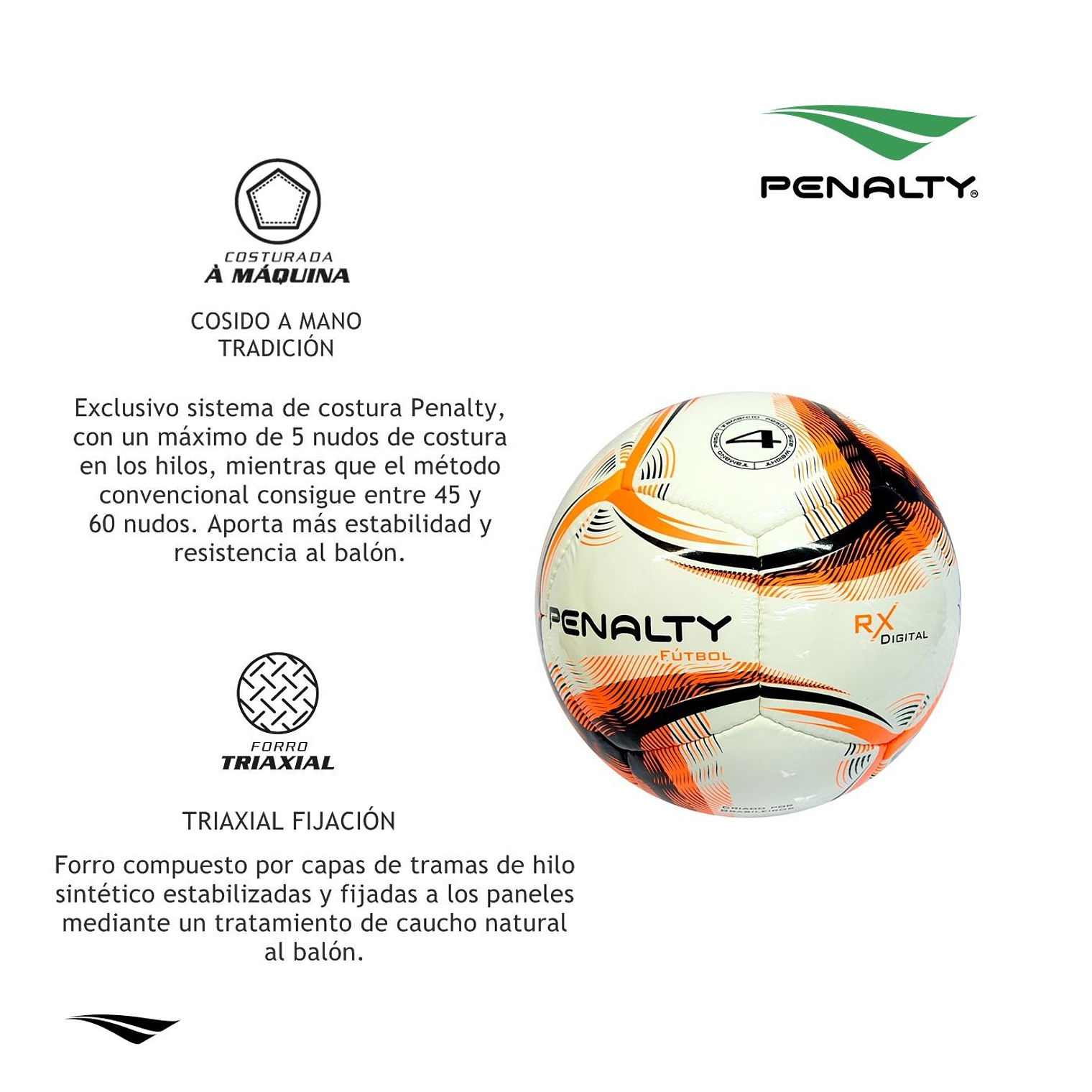 - Cosido a mano: Exclusivo sistema de costura Penalty con hasta 5 nudos de costura en comparación con los 45-60 nudos convencionales, brindando mayor estabilidad y resistencia al balón
